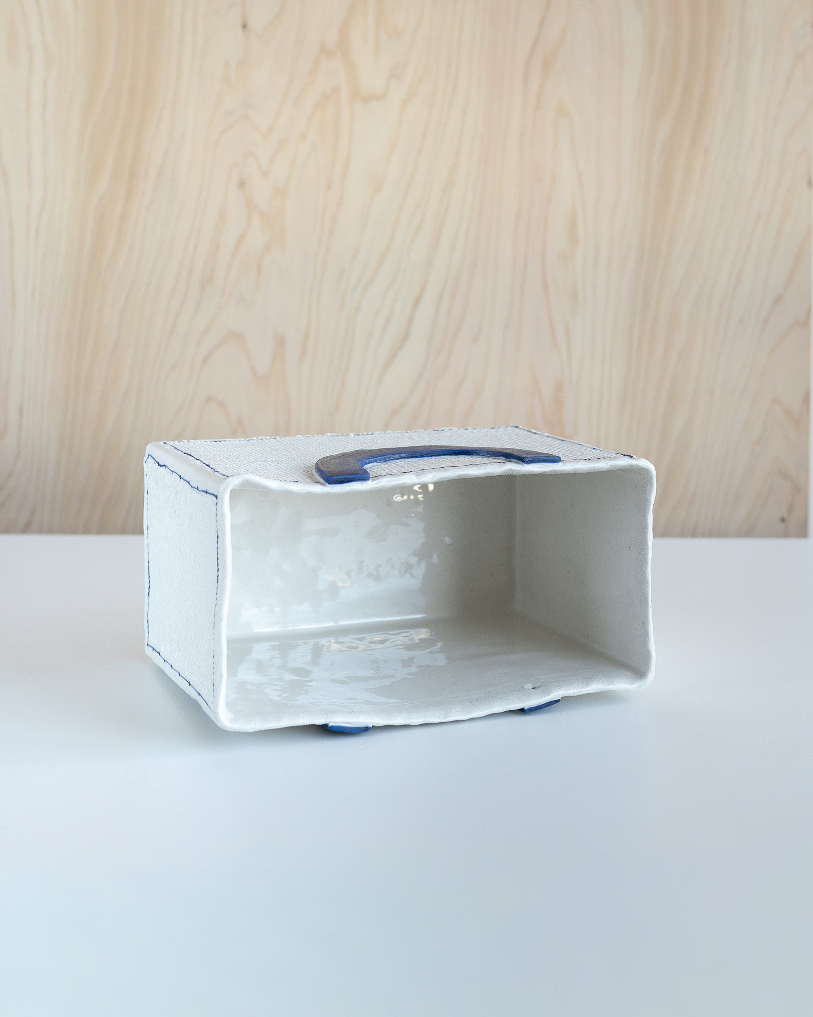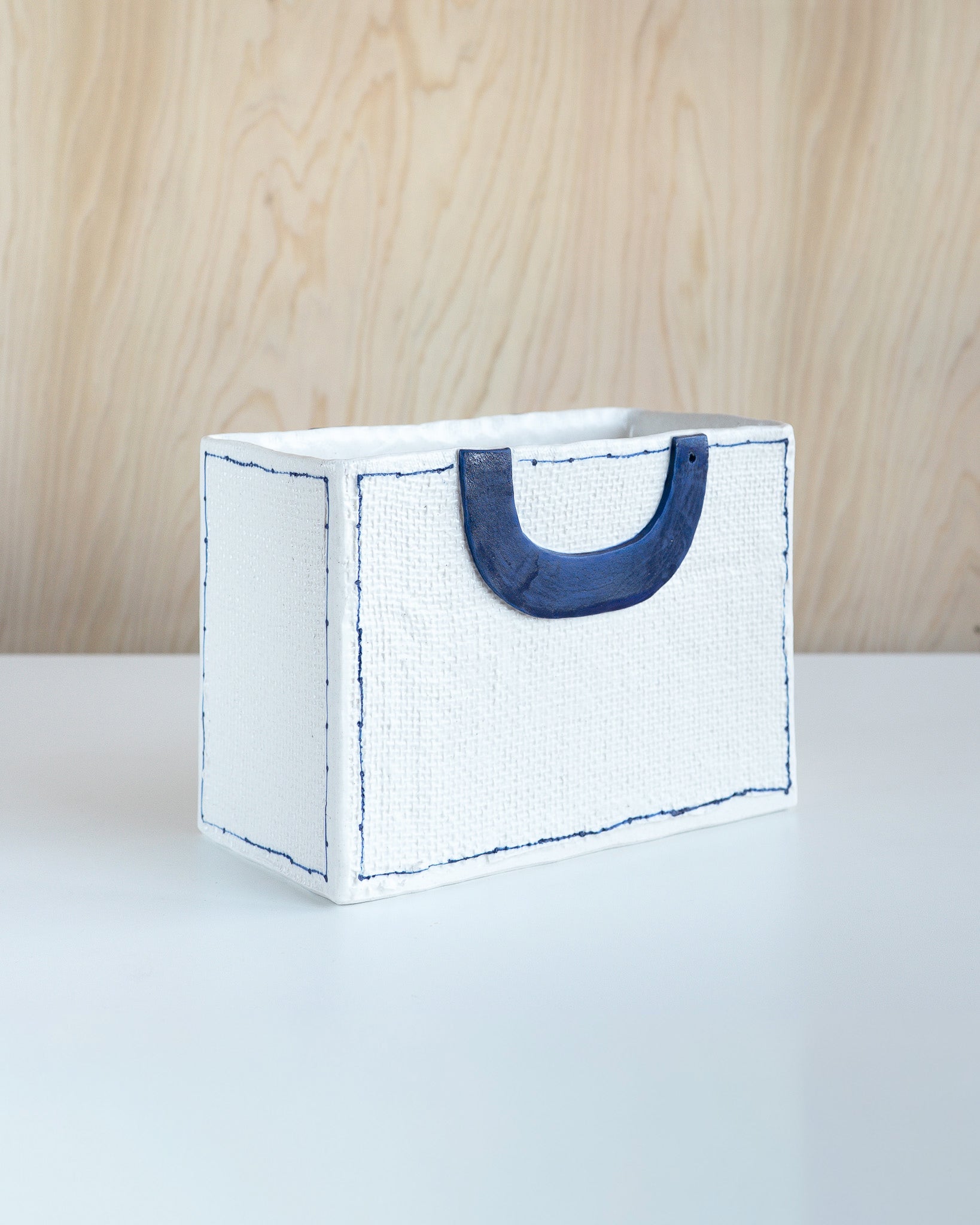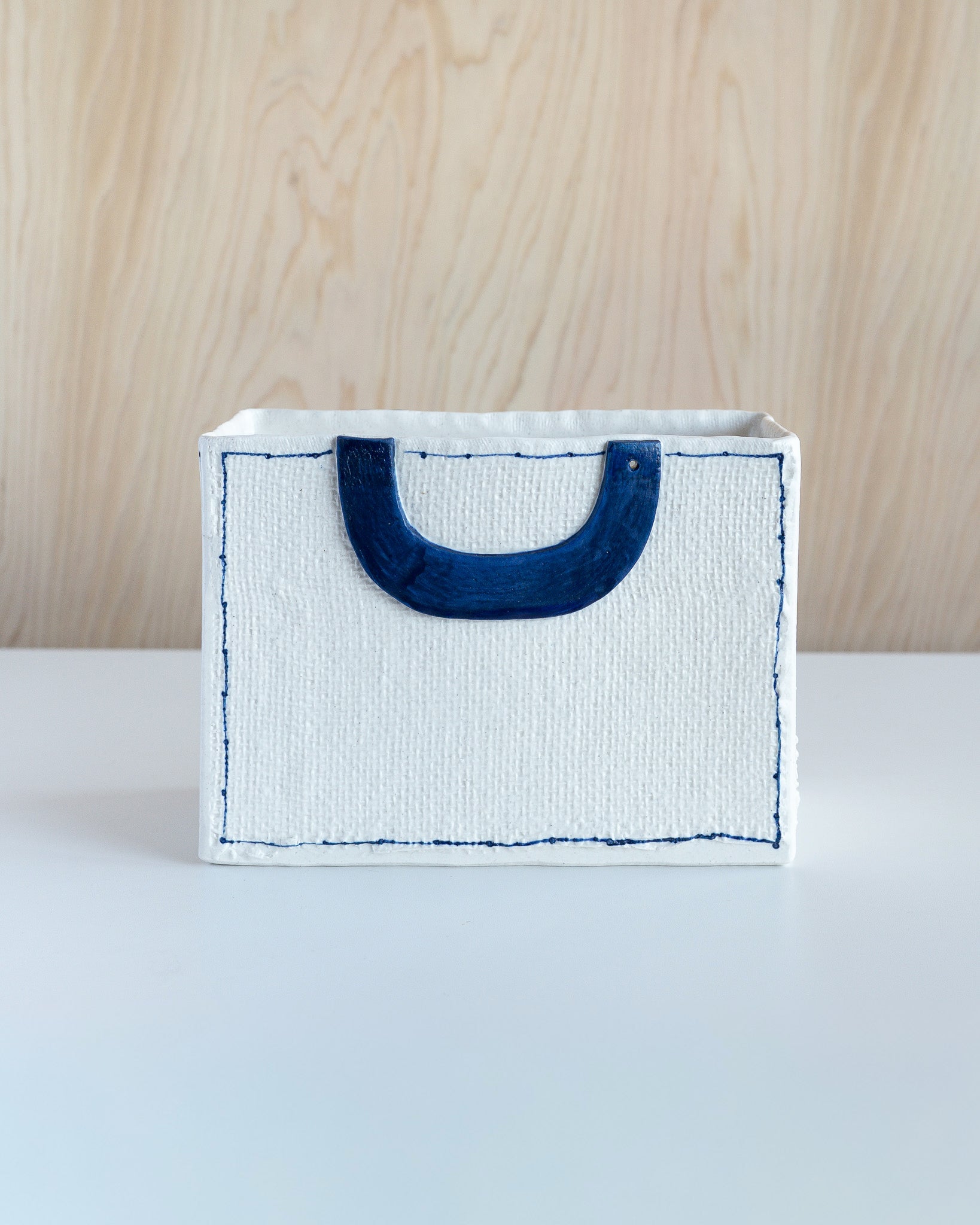 Although it is made of ceramic, it has a soft texture and form like fabric, and each blue stitch is carefully hand-painted. This basket with a cloth-like texture can be used to store small items, display flowers, or simply displayed on a shelf as an interior decoration.
