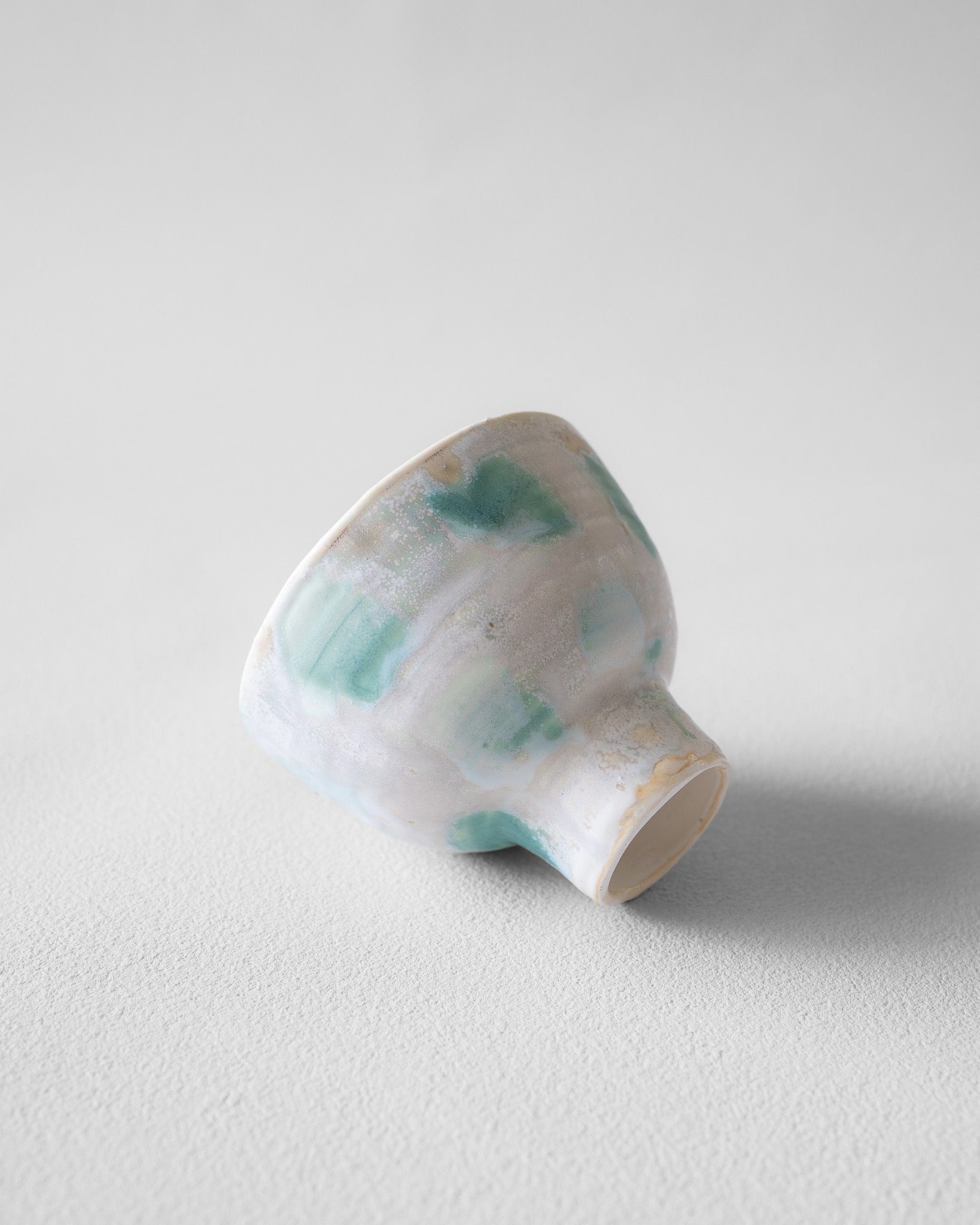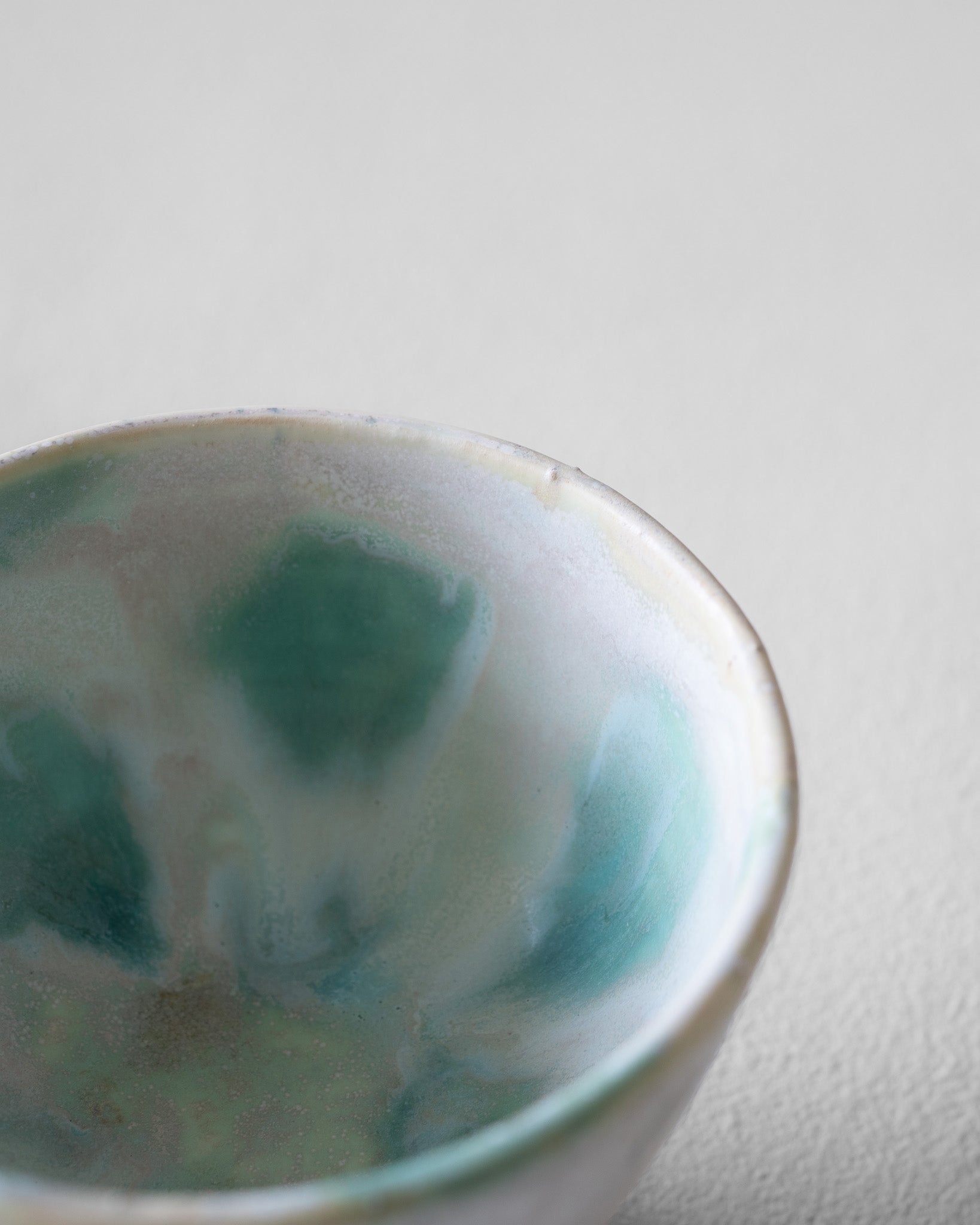 釉薬や化粧土を組み合わせる「釉彩」という技法で仕上げられており、表面には繊細な結晶の煌めきが浮かび上がります。マットな質感の中に、滲むような色のグラデーションが現れ、ひとつとして同じもののない豊かな表情を見せてくれます。