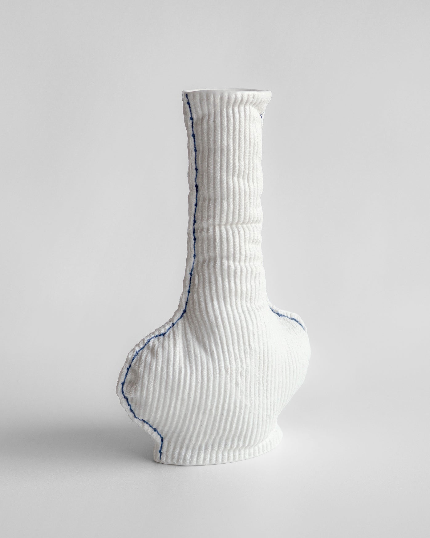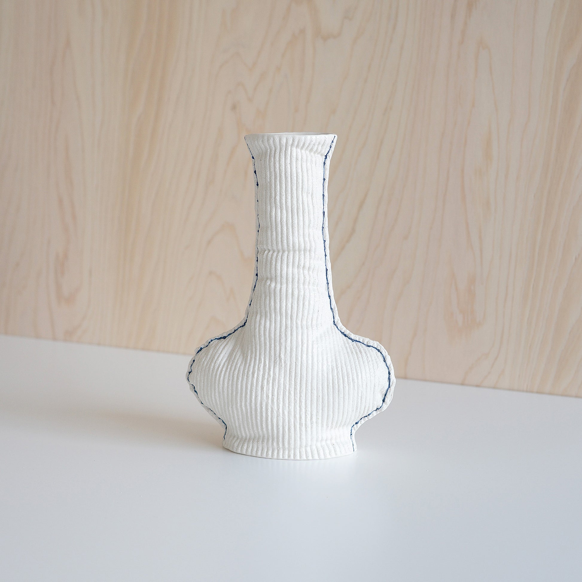陶器でありながら布のような柔らかい質感とフォルムを持ち、青いステッチがひとつひとつ手描きで丁寧に施されています。布の質感をまとったフラワーベースは、Jung So hyeさんの手仕事が感じられる温もりが宿っています。小さなお花を飾ったり、そのまま棚などにインテリアとして飾りお楽しみください。