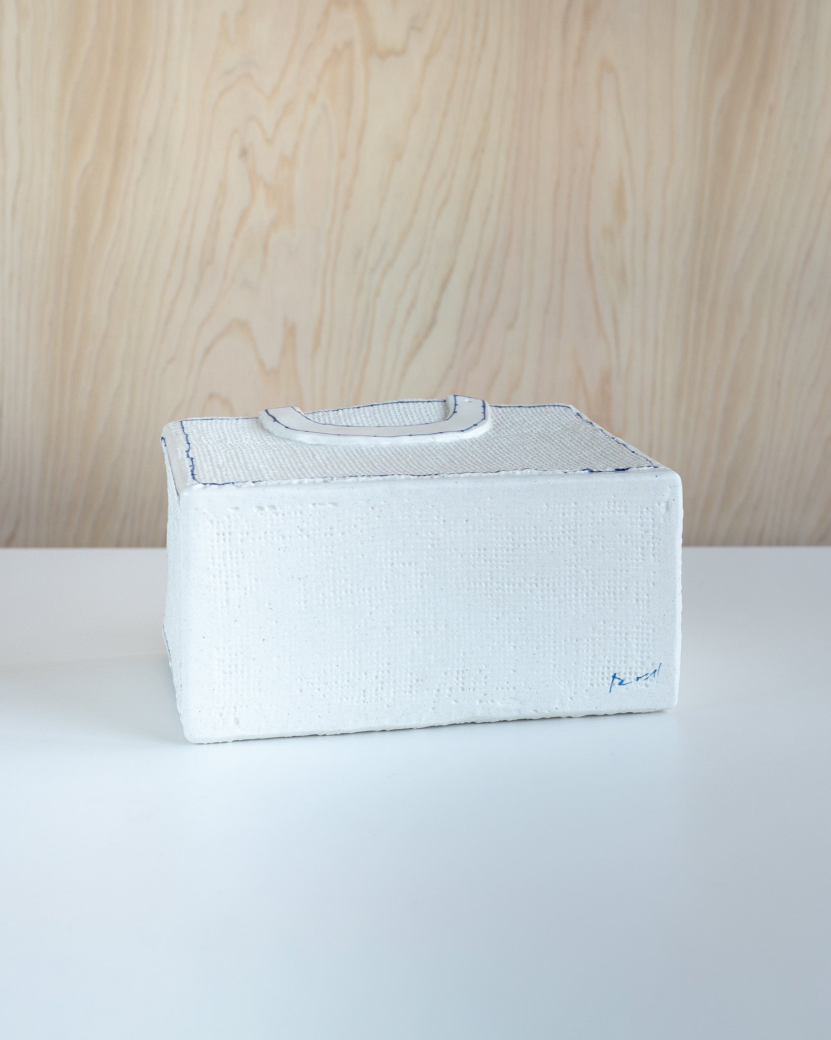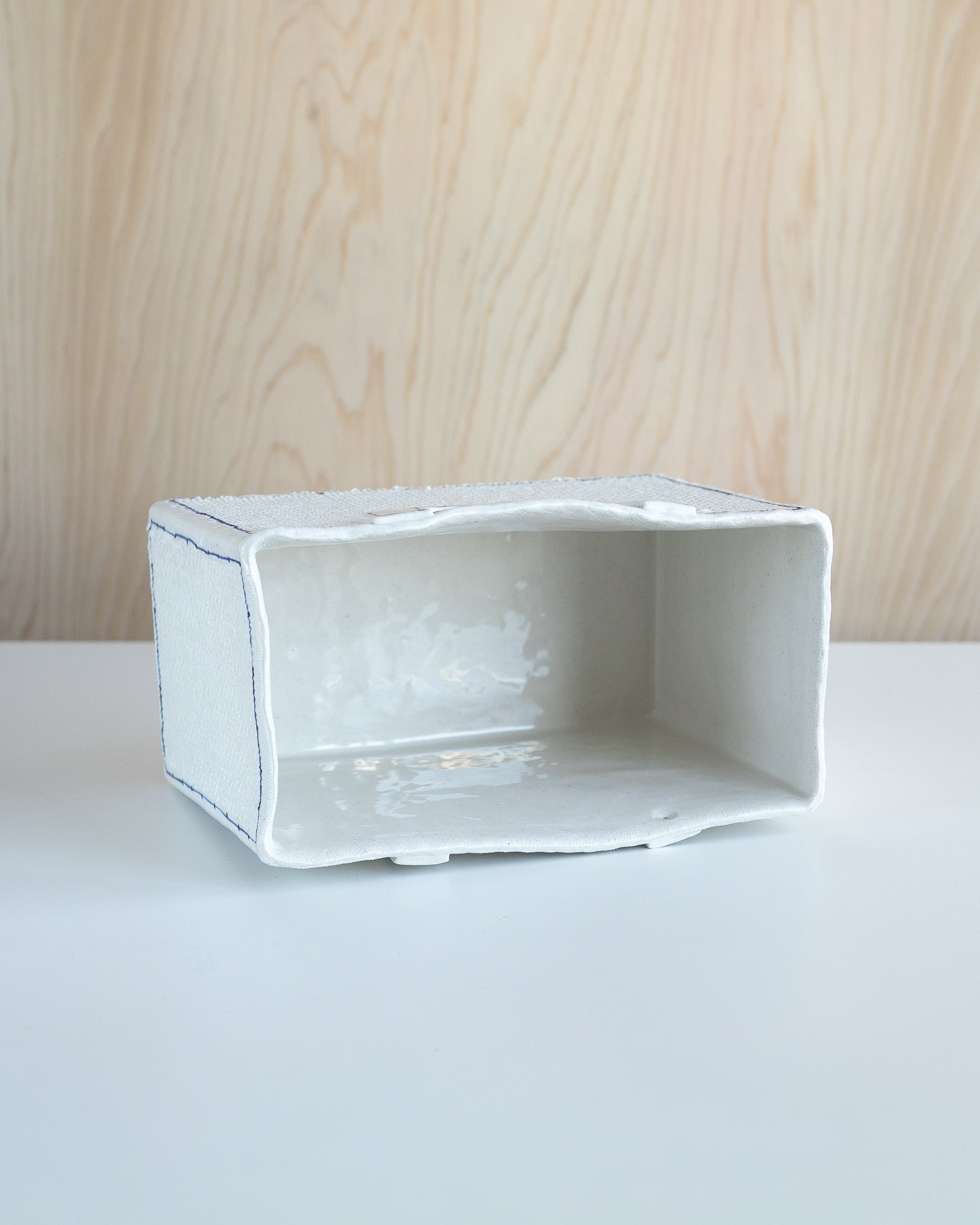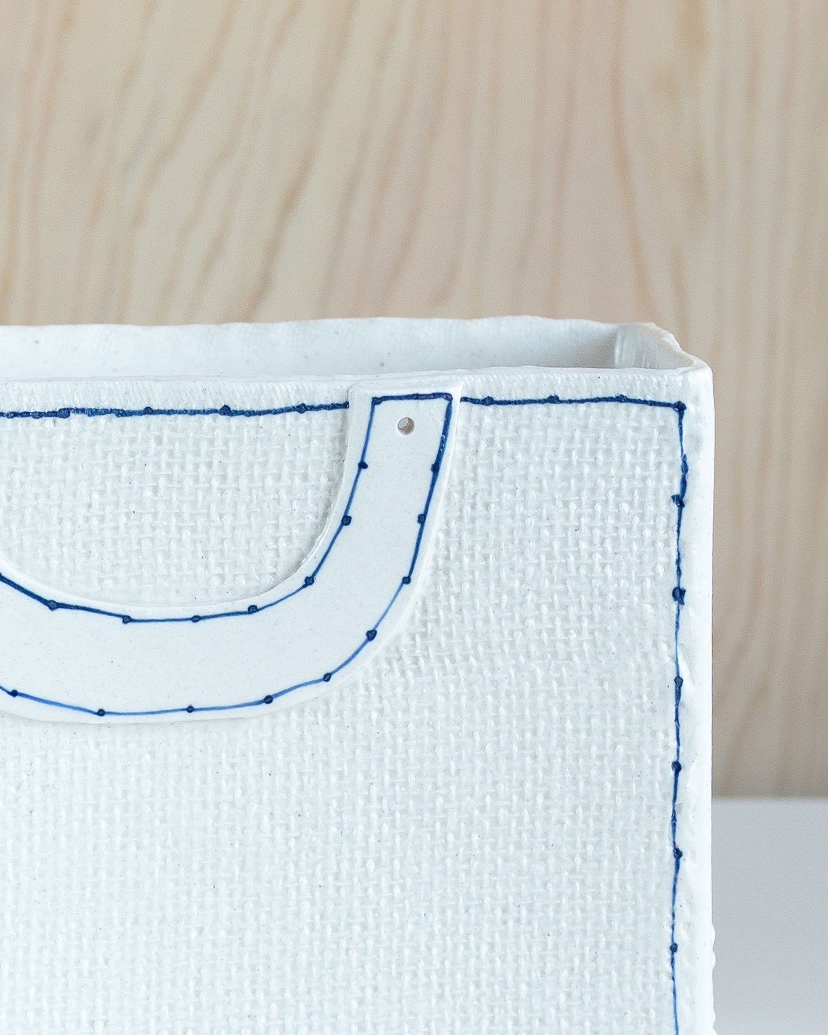 陶器でありながら布のような柔らかい質感とフォルムを持ち、青いステッチがひとつひとつ手描きで丁寧に施されています。布の質感をまとったバスケットは、小物入れやお花を飾ったり、そのまま棚などにインテリアとして飾りお楽しみいただけます。