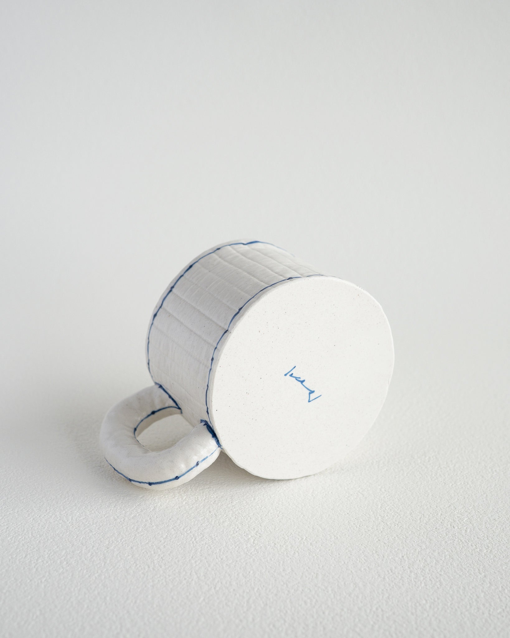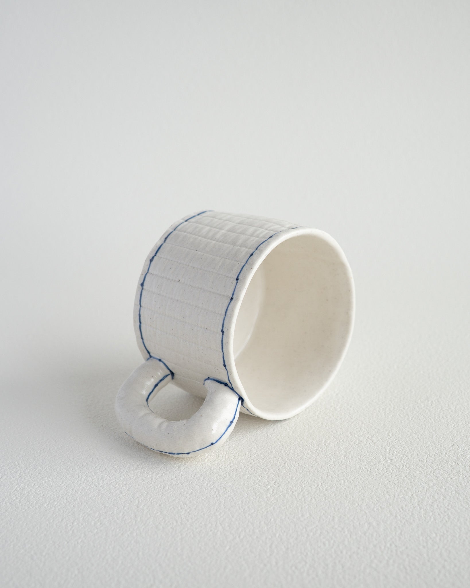キルティングを思わせるテクスチャーに、丁寧に手描きされた青いステッチが映えるデザインです。布のようなやわらかさを感じさせる温かい風合いとユニークなデザインが、お家時間を楽しくしてくれます。