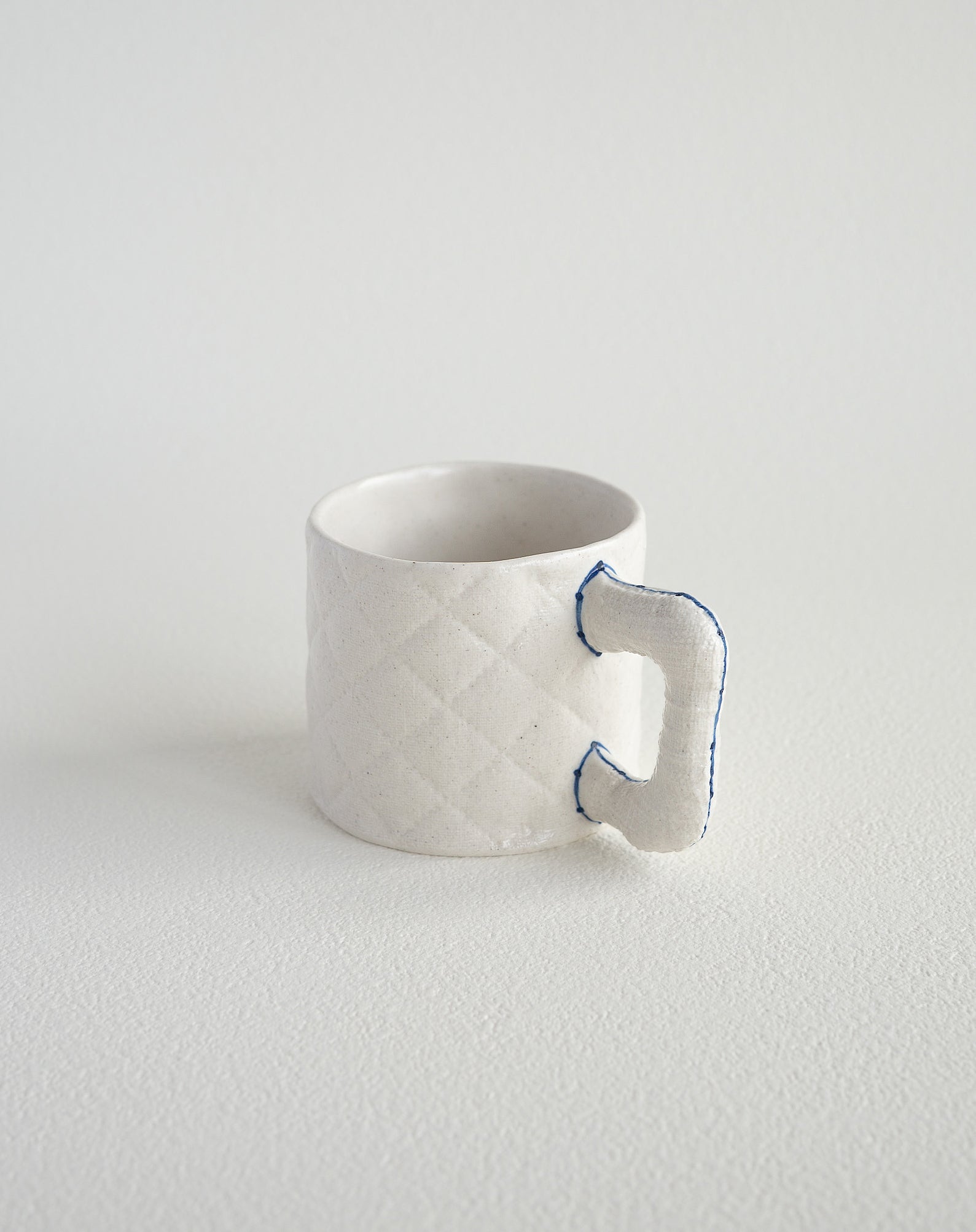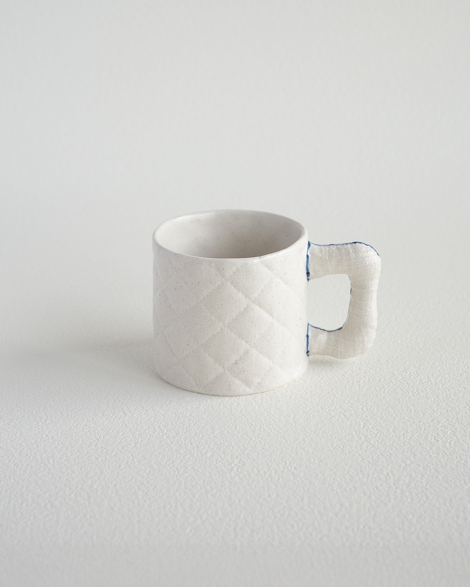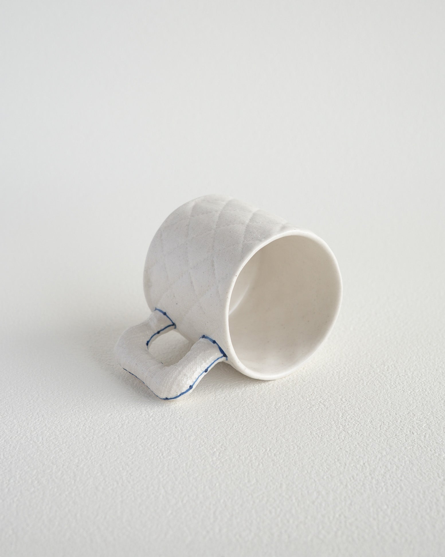 キルティングを思わせるテクスチャーに、丁寧に手描きされた青いステッチが映えるデザインです。布のようなやわらかさを感じさせる温かい風合いとユニークなデザインが、お家時間を楽しくしてくれます。