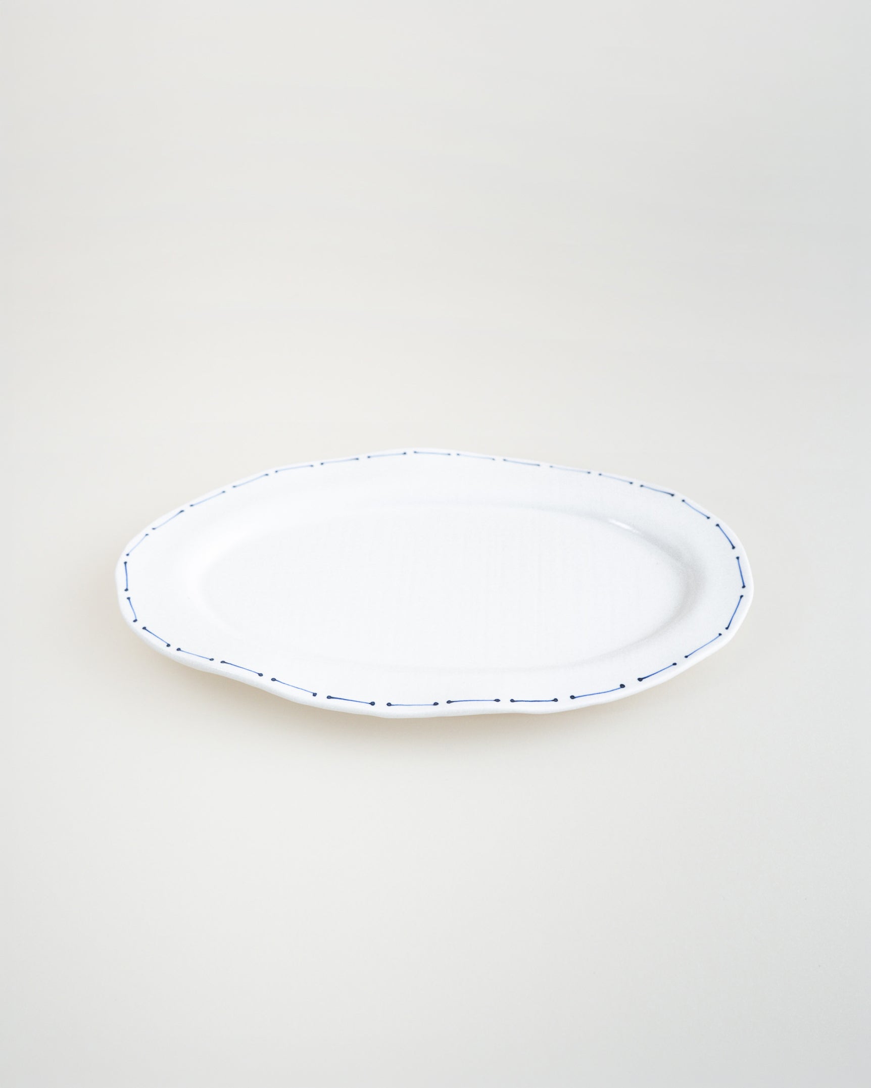 布の質感を再現した表面と、一つ一つ丁寧に手作業で描かれた縫い糸のステッチが魅力のプレートです。シンプルながら温かみのあるデザインは、料理を美しく引き立てるだけでなく、テーブル全体にやさしい雰囲気を添えてくれます。