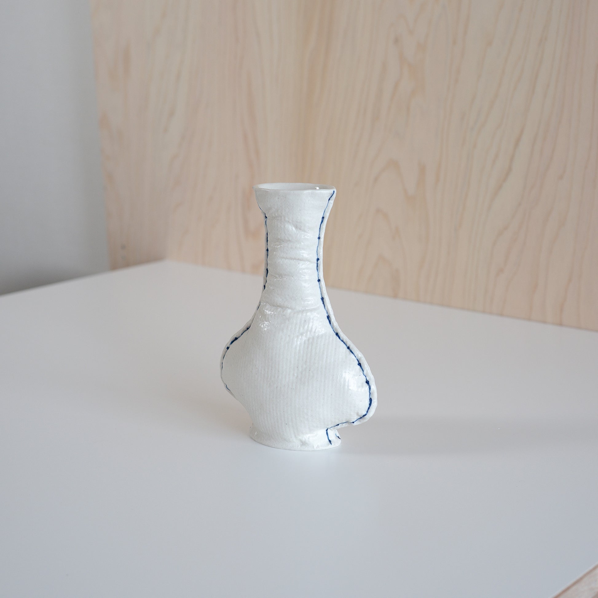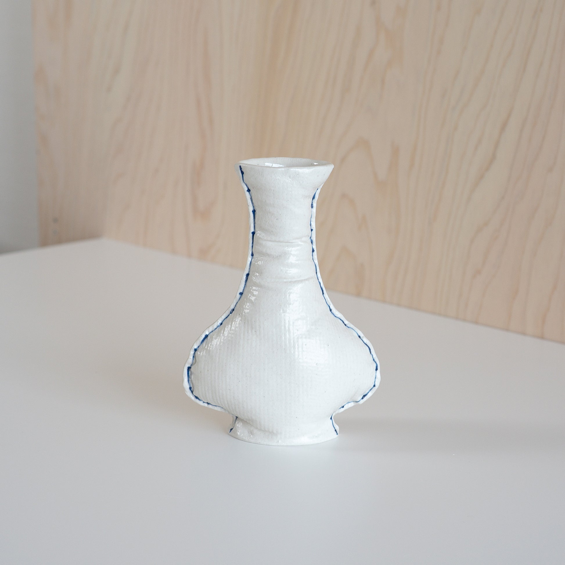 陶器でありながら布のような柔らかい質感とフォルムを持ち、青いステッチがひとつひとつ手描きで丁寧に施されています。布の質感をまとったフラワーベースは、Jung So hyeさんの手仕事が感じられる温もりが宿っています。小さなお花を飾ったり、そのまま棚などにインテリアとして飾りお楽しみください。