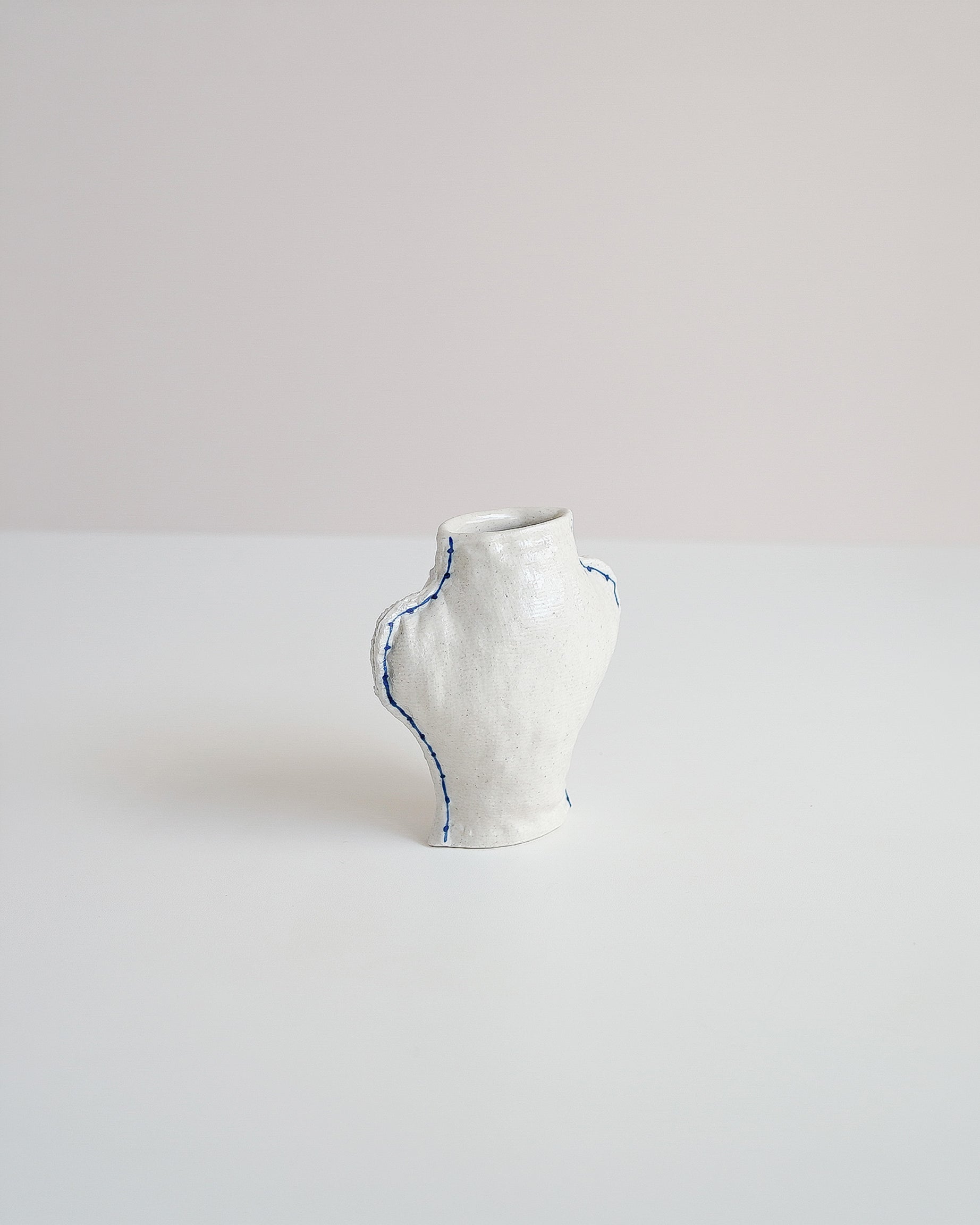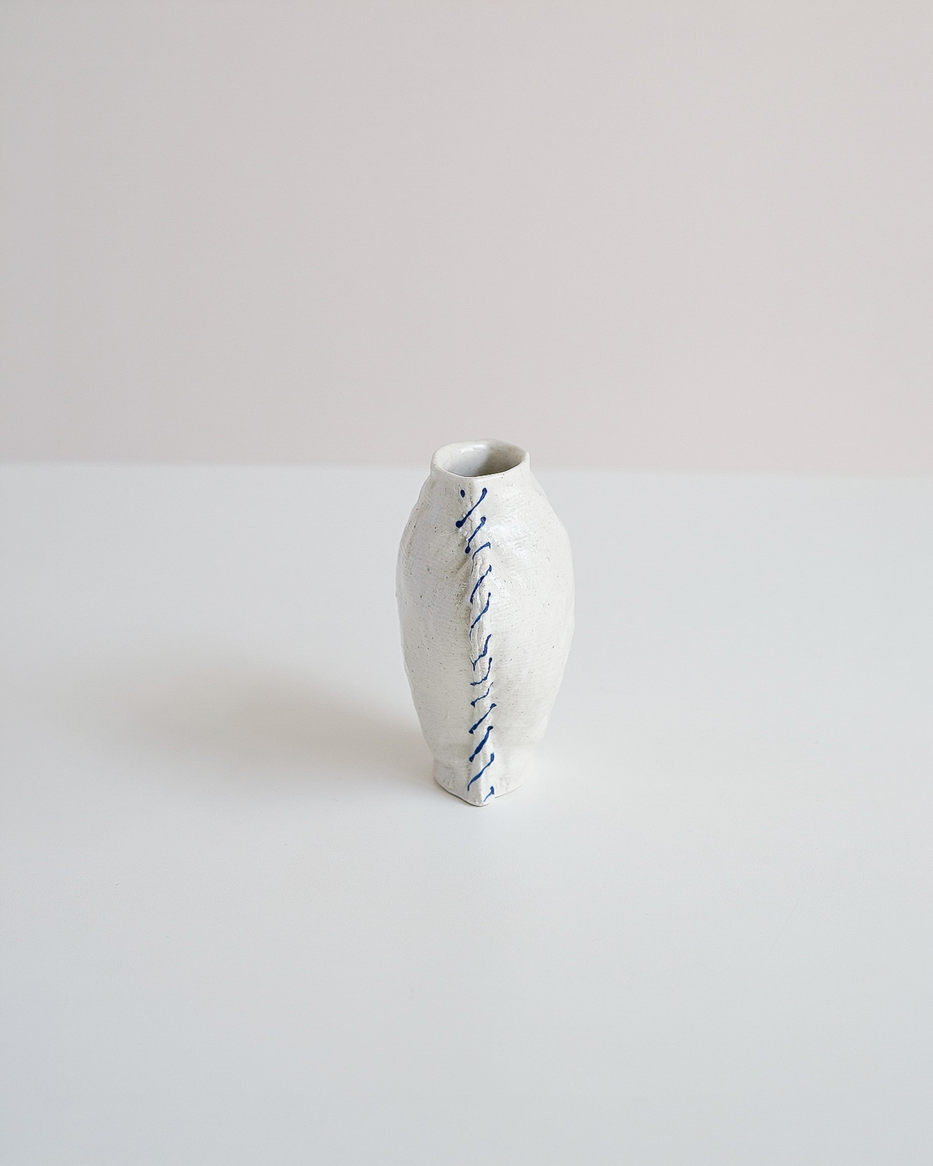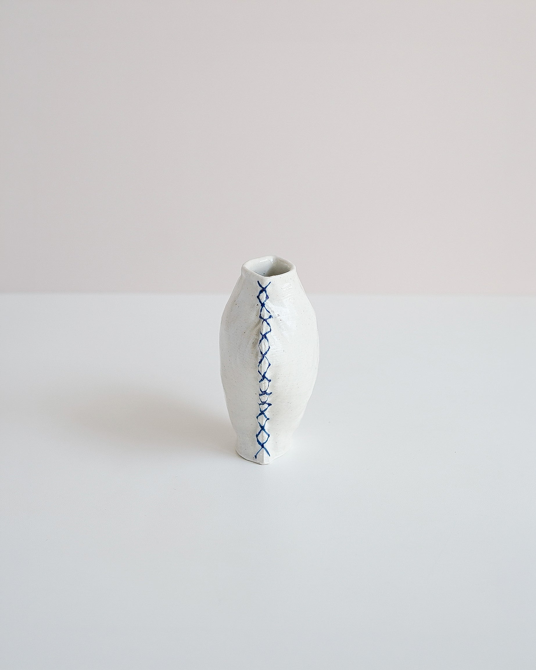 陶器でありながら布のような柔らかい質感とフォルムを持ち、青いステッチがひとつひとつ手描きで丁寧に施されています。布の質感をまとったフラワーベースは、Jung So hyeさんの手仕事が感じられる温もりが宿っています。小さなお花を飾ったり、そのまま棚などにインテリアとして飾りお楽しみください。