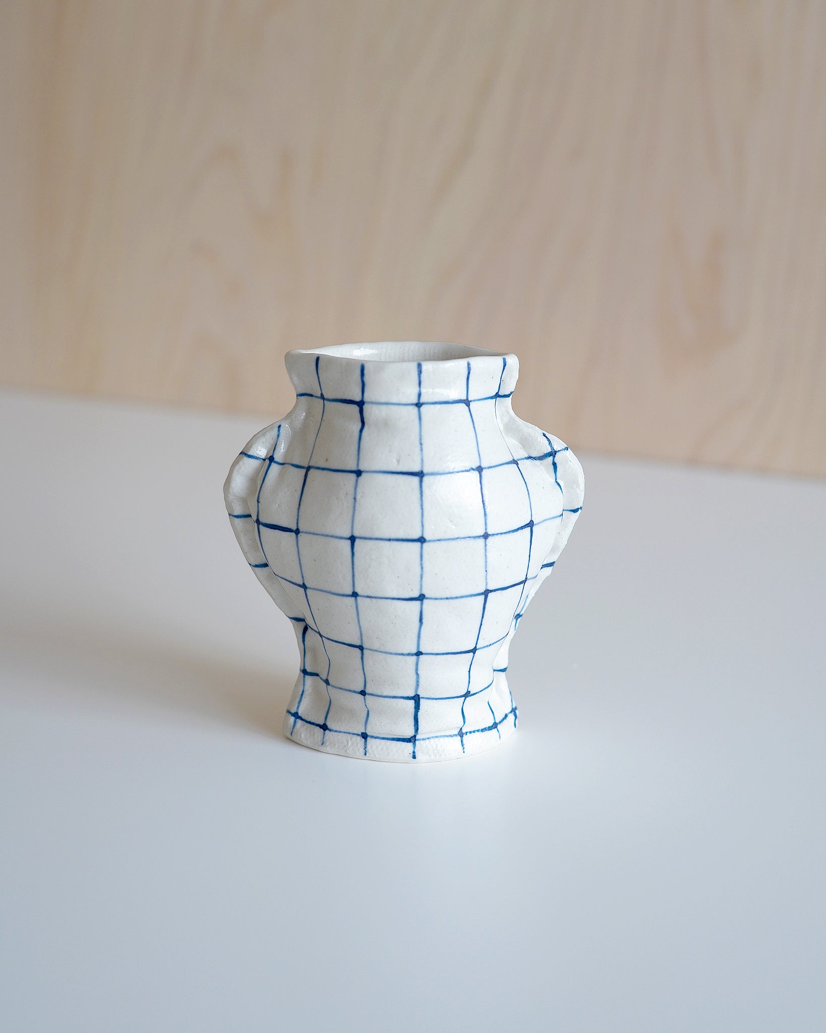 陶器でありながら布のような柔らかい質感とフォルムを持ち、青いチェック柄はひとつひとつ手描きで丁寧に施されています。布の質感をまとったフラワーベースは、Jung So hyeさんの手仕事が感じられる温もりが宿っています。小さなお花を飾ったり、そのまま棚などにインテリアとして飾りお楽しみください。